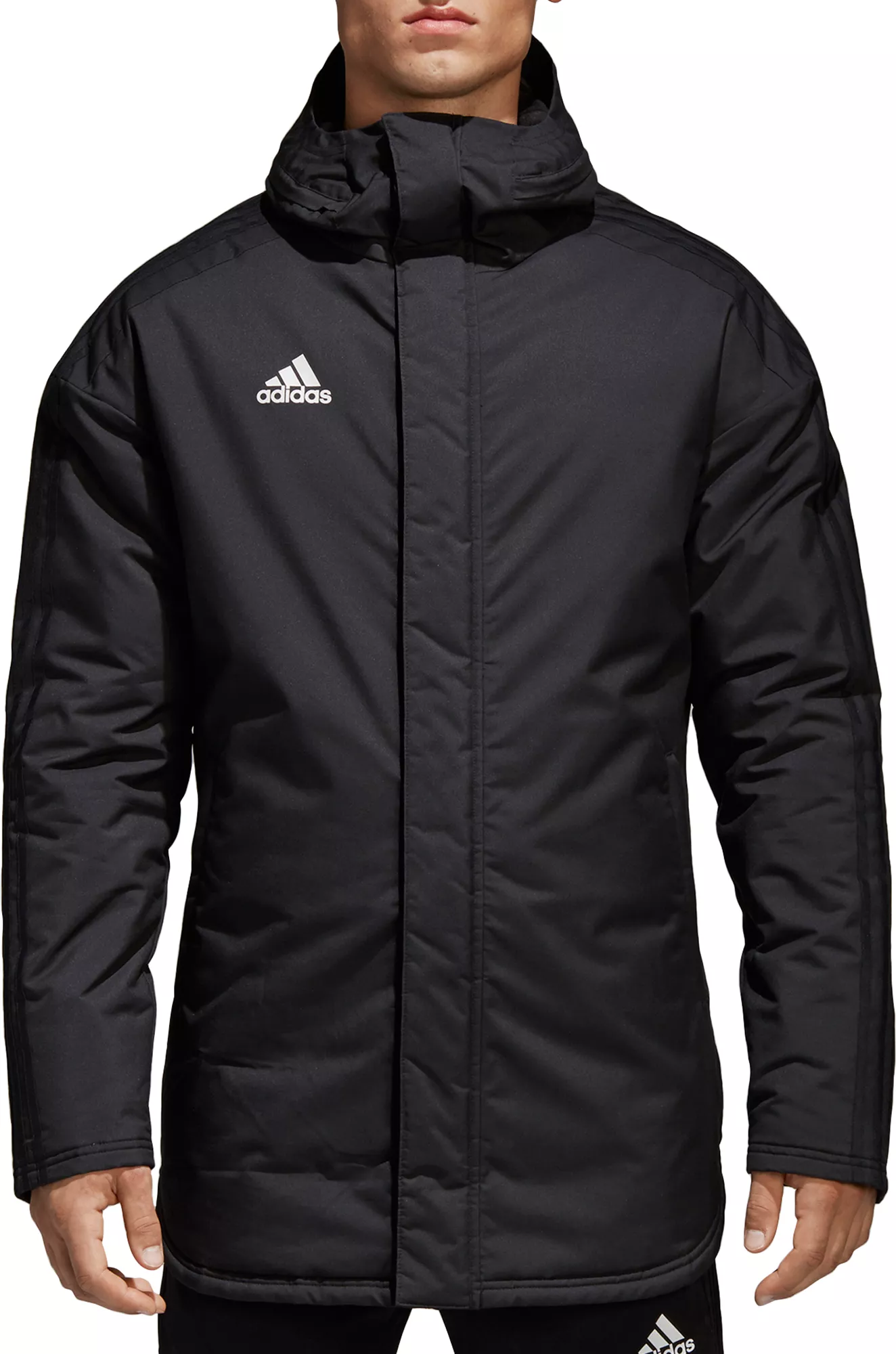 Flawlessly make your shot on goal, despite cold conditions, in the adidas® Men’s Soccer Stadium 18 Parka. This jacket has performance fabric that keeps you warm and cozy, while details like a hood with storm flap and a curved back hem with snap ensure you have enough coverage to block out the cold. Dropped shoulders add to the comfort, and front zip pockets store your small valuables.